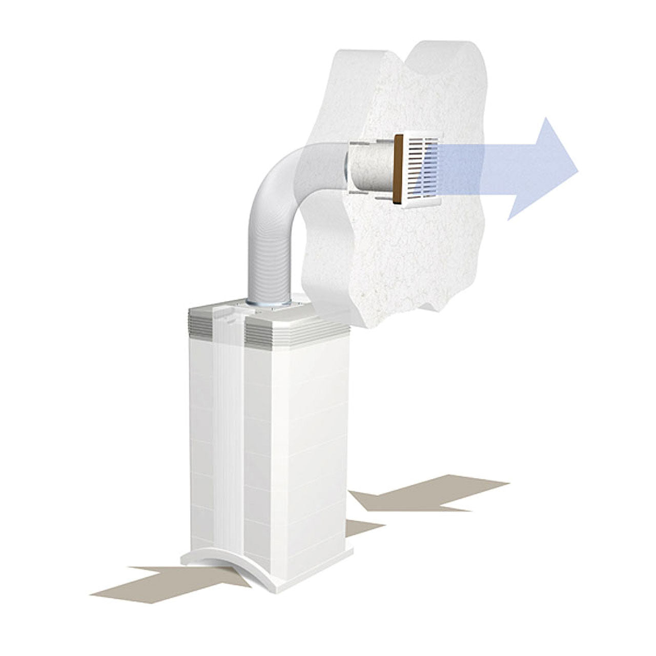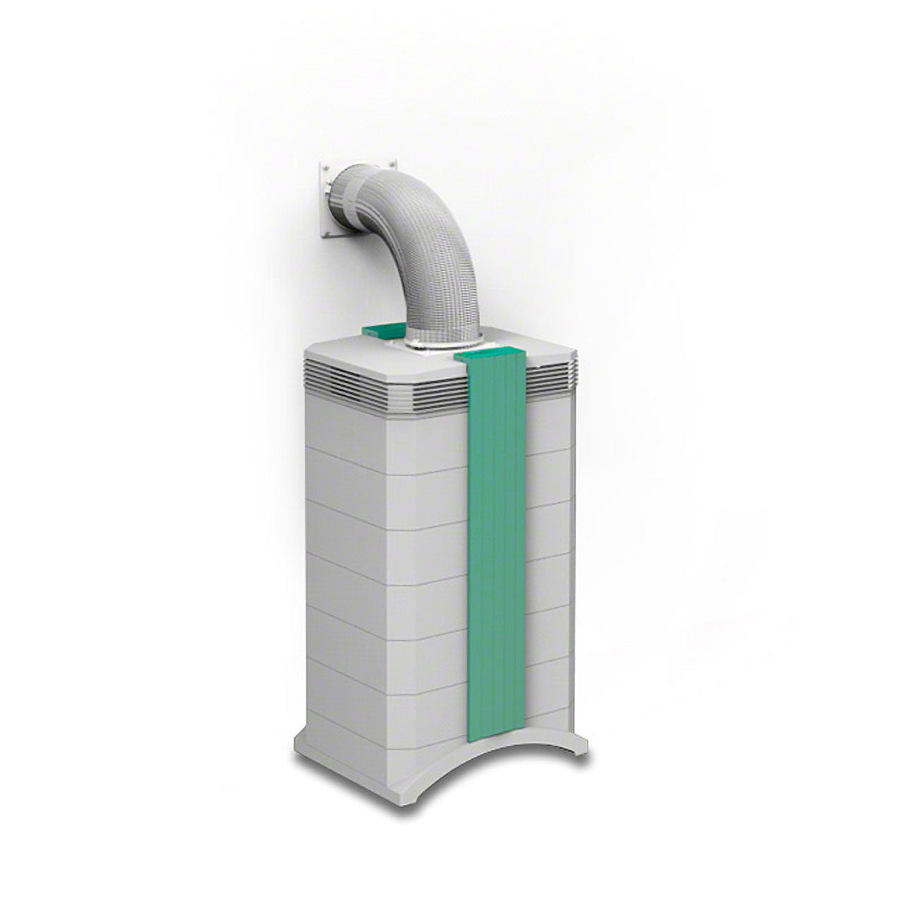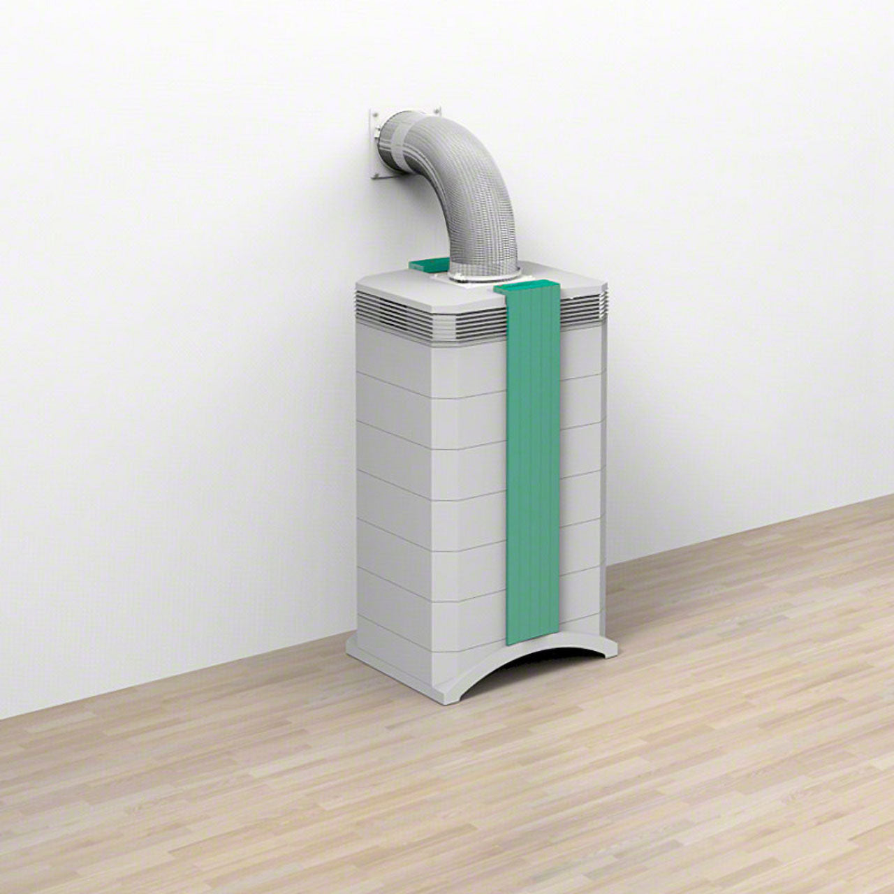 Jedes IQAir-System lässt sich schnell und einfach aufrüsten. Benötigt wird nur eine Wand- oder Fensteröffnung (Durchmesser ca. 140 mm). Durch den großen Durchmesser der Leitungsverbindung wird der Luftwiderstand herab gesetzt. Der flexible Schlauch lässt sich in jede gewünschte Richtung biegen und kann von 250 mm im ursprünglich komprimierten Zustand bis auf 1000 mm verlängert werden.